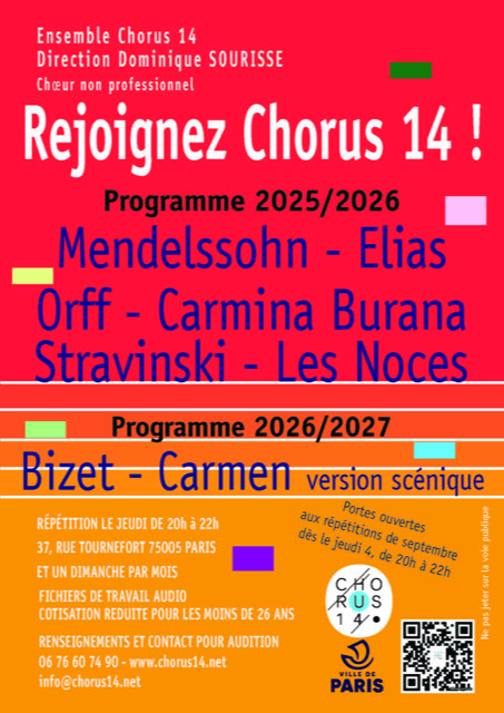 L’ensemble Chorus 14, Paris 5ème, direction Dominique Sourisse,  recrute tous pupitres, ténors et basses en particulier pour chanter en juin 2026 les Carmina Burana de C. Orff et Les Noces …